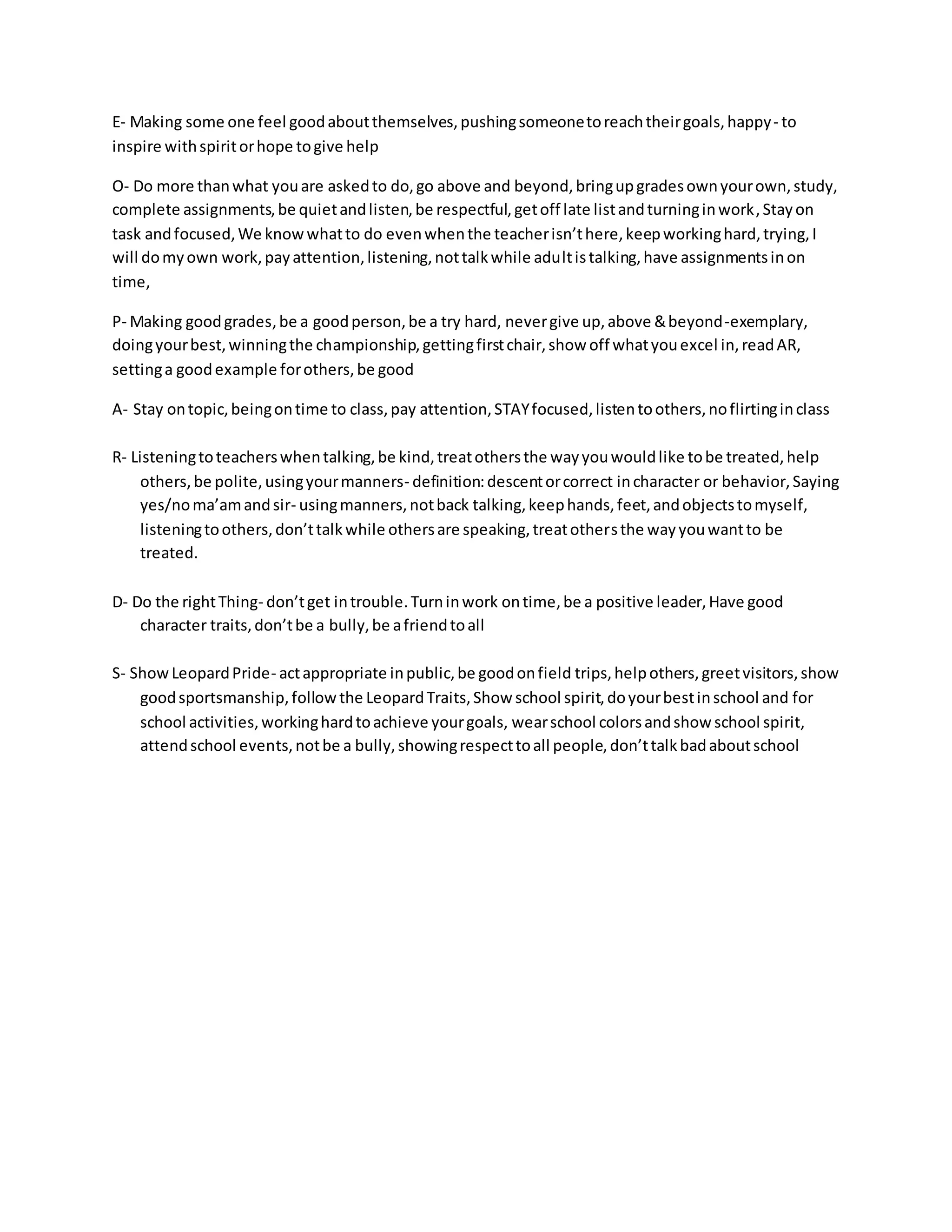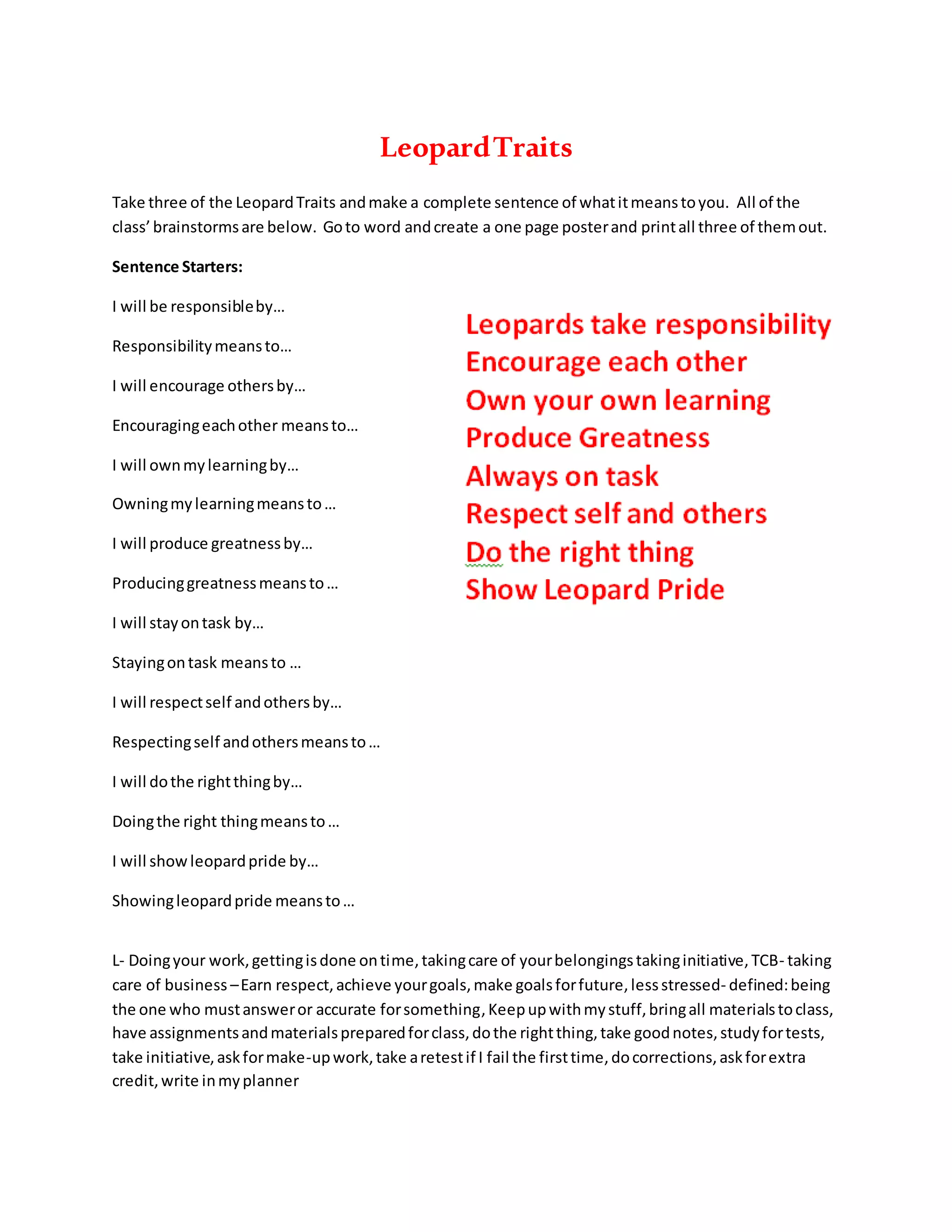 The document lists traits of leopards and sentences starters for students to complete to describe how they will demonstrate the traits. It includes the leopard traits of being responsible, encouraging others, owning one's learning, producing greatness, staying on task, respecting oneself and others, and doing the right thing. Students are instructed to choose three traits and complete a sentence for each to create a one page poster.