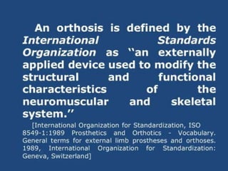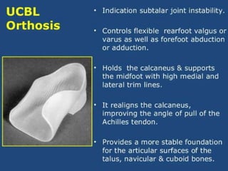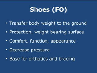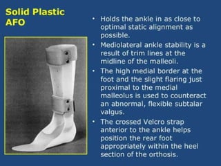 Foot orthosis (FO) and ankle foot orthosis (AFO) are devices designed to support and manage foot deformities and symptoms. AFOs can be articulating or non-articulating and are made of various materials to facilitate different functionalities during daily activities. Key components of AFOs work together to stabilize the knee and ensure proper foot positioning.