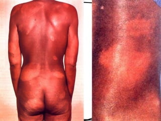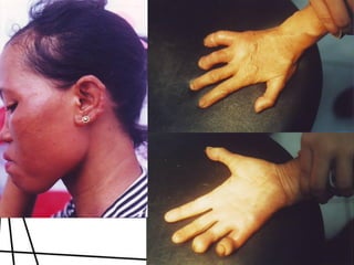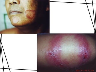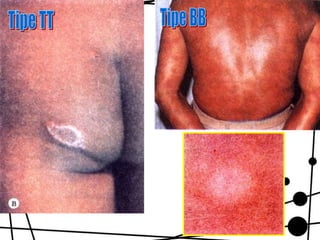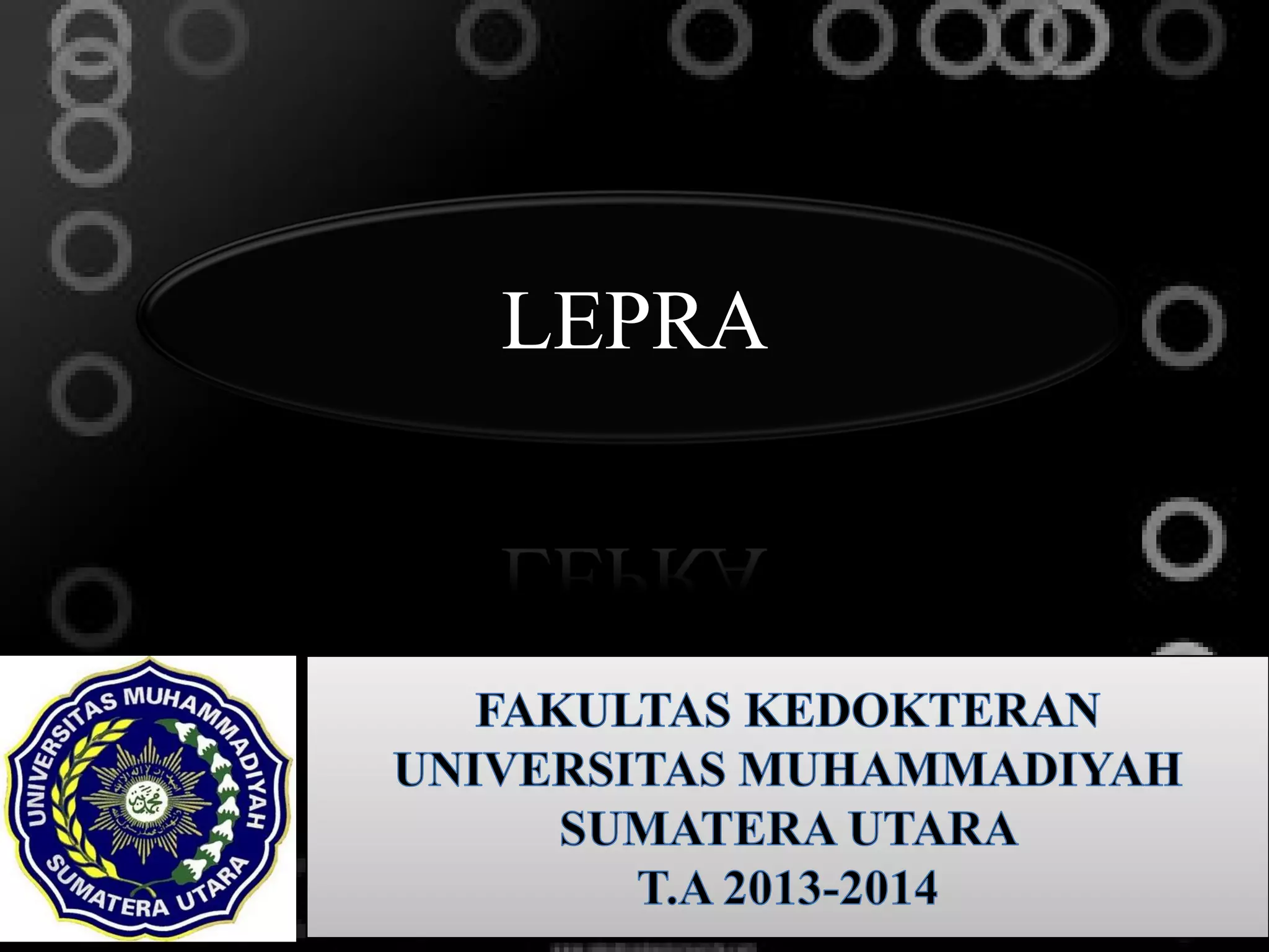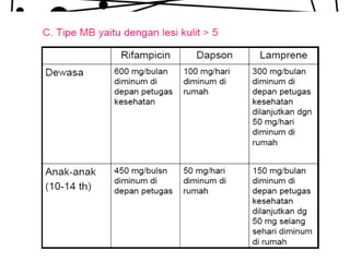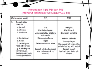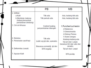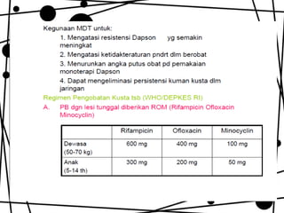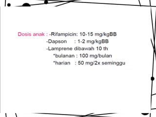 Dokumen ini membahas tentang lepra, termasuk definisi, etiologi, klasifikasi, gejala, cara diagnosis, penatalaksanaan, dan pencegahan penyakit ini. Lepra disebabkan oleh Mycobacterium leprae dan dapat menimbulkan cacat serius jika tidak ditangani dengan benar. Diagnosa dan pengobatan dini sangat penting untuk mencegah penyebaran dan komplikasi lebih lanjut.