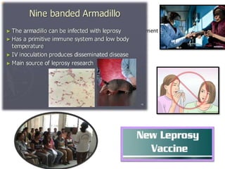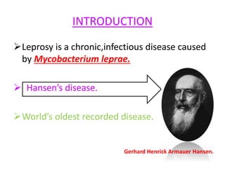 This document provides an overview of leprosy (Hansen's disease). It begins by introducing leprosy as a chronic infectious disease caused by Mycobacterium leprae. It then describes the different classifications of leprosy including lepromatous, tuberculiod, dimorphous, and indeterminate. Symptoms include numbness, skin lesions, hair loss, and facial disfigurement. Diagnosis involves demonstration of acid-fast bacilli in lesions through staining, testing for sensory loss, and biopsy. Treatment options are also discussed along with references used.