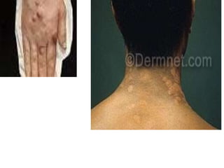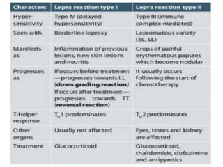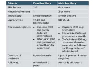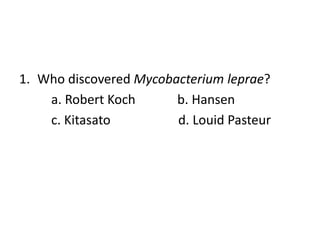 This document contains an MCQ discussion on leprosy. It begins with 13 multiple choice questions about leprosy, including topics like who discovered the causative bacteria, the generation time of Mycobacterium leprae, clinical presentations of leprosy, types of leprosy, treatment, and more. The document then provides explanations and key facts about leprosy, including that it is caused by Mycobacterium leprae, clinical features, types according to skin smear and clinical classification, signs and symptoms, pathogenesis, diagnosis including skin smear microscopy, and treatment with multidrug therapy.