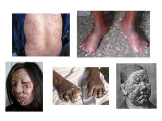 Leprosy, also known as Hansen's disease, is a chronic infectious disease caused by Mycobacterium leprae bacteria. It primarily affects the skin, nerves, and mucous membranes, causing skin lesions with numbness and sensory loss. Leprosy is transmitted through droplets from the nose and mouth during close and frequent contact with untreated cases. It has been classified into different types based on immune response and symptoms, ranging from tuberculoid leprosy with a strong immune response to lepromatous leprosy with a weak response. Treatment involves multidrug therapy over 12 months using drugs like rifampicin, dapsone and clofazimine to control symptoms and prevent further transmission.