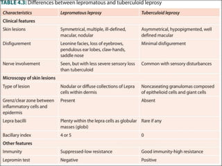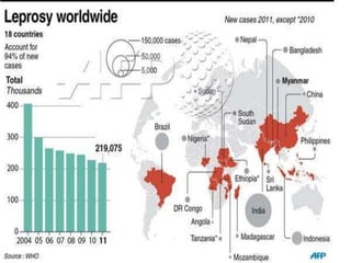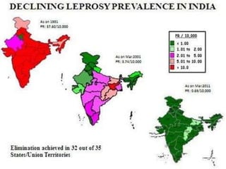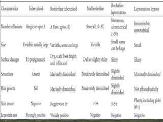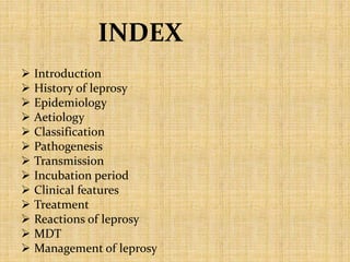 This document provides an overview of leprosy (Hansen's disease). It discusses the history, epidemiology, etiology, classification, pathogenesis, transmission, clinical features, treatment, reactions, and management of leprosy. Leprosy is caused by Mycobacterium leprae and mainly affects the skin and peripheral nerves. It is treated using multidrug therapy regimens as recommended by the WHO. Management involves treatment, prevention of disabilities, and social integration programs.