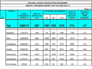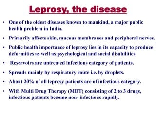 This document provides an overview of leprosy in India, including its transmission, diagnosis, treatment, and the national program to eliminate leprosy. Some key points: