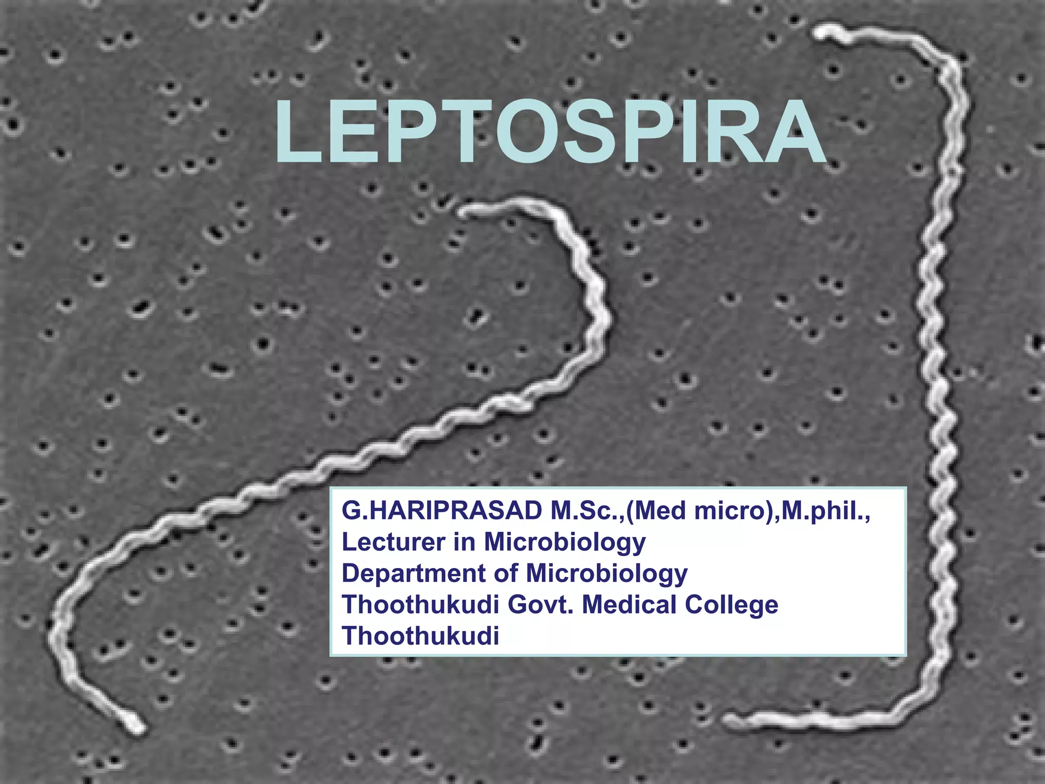 Leptospira is a spirochete bacteria that can cause leptospirosis in humans. There are pathogenic and non-pathogenic strains, with L. interrogans being the primary human pathogen containing 26 serogroups. Infection typically occurs through contact with water contaminated by the urine of infected rodents. Symptoms include fever, jaundice, and hemorrhaging. Laboratory diagnosis involves dark-field microscopy, culture, serological tests, and animal inoculation to identify the infecting serotype. Treatment involves antibiotics like penicillin and tetracycline.