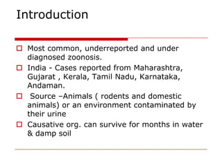 Leptospirosis is a zoonotic bacterial disease caused by Leptospira interrogans. It is transmitted to humans via contact with water or soil contaminated by the urine of infected animals. Clinical features range from a mild flu-like illness to a potentially fatal disease affecting multiple organ systems. Diagnosis involves serological tests, culture, PCR and microscopic examination of body fluids. Treatment of severe cases requires supportive care and antibiotics such as penicillin or doxycycline to shorten illness duration and reduce mortality. Prevention focuses on controlling animal reservoirs and interrupting transmission routes.