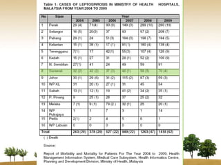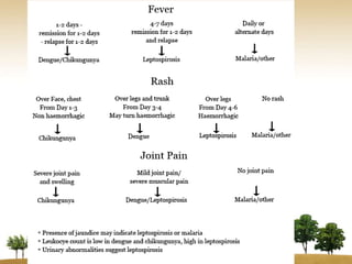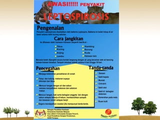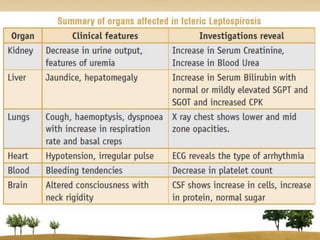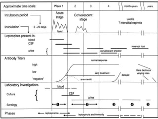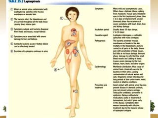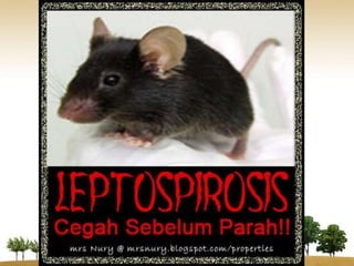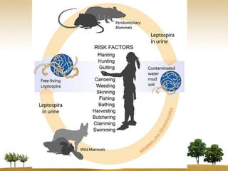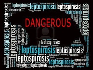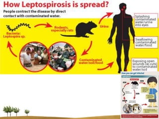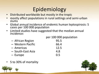 Leptospirosis is a bacterial disease caused by Leptospira interrogans that is distributed worldwide but mostly affects populations in rural and semi-urban areas. It is transmitted through contact with water or soil contaminated by infected animal urine. Clinical presentation varies from mild flu-like symptoms to severe disease affecting multiple organs. Diagnosis involves serological tests, culture or PCR. Treatment is with doxycycline or penicillin with supportive care for organ complications. Prevention focuses on rodent control, vaccination of animals, and avoiding contact with contaminated water sources.