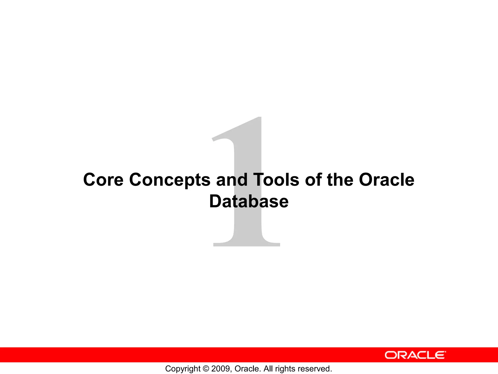 This document provides an overview of Oracle database concepts and tools. It describes the core components of an Oracle database including the database, server processes, memory structures, and client/server architecture. It also outlines the tools used to configure an Oracle database such as the Oracle Universal Installer, Database Configuration Assistant, and command line utilities. Automatic Storage Management (ASM) is discussed as the preferred storage management solution.