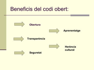 Beneficis del codiobert: Obertura Transparència Seguretat Aprenentatge Herència cultural