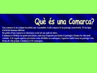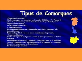 Comarques i capitals(de muntanya) VALL D’ARAN capital Vielha ALTA RIBAGORÇA “ El Pont de Suert PALLARS JUSSÀ “ Tremp PALLARS SOBIRÀ “ Sort ALT URGELL “ La Seu d’Urgell CERDANYA “ Puigcerdà RIPOLLÈS “ Ripoll BERGUEDÀ “ Berga GARROTXA “ Olot