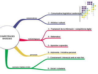 Possibles estratègies d’impúlsde la comp. d’aprendre a aprendre : Des de totes les àrees: Afavorir l’autoregulació de l’aprenentatge i el coneixement de les pròpies mancances, mitjançant: - exercicis d’autoavaluació i coavaluació. - ús consensuat d’eines de control de l’aprenentatge, com dietaris, agendes, portafolis de treball … Des de la tutoria ( en col·laboració amb els pares) : Treballar sistemàticament aspectes de dinàmica personal, habilitats conductuals… Treballar l’autoconcepte mitjançant diversos instruments: jocs, dinàmiques de grup… Des d’àrees de llengües: Resum, síntesi, anàlisi de textos… Des d’àrees de ciències ( i Educació Física) : Higiene de l’estudi , hàbits saludables…