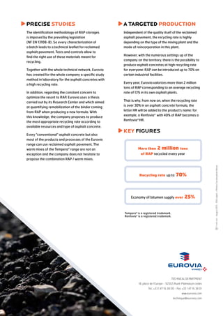 Eurovia focuses on sustainable asphalt concrete production by incorporating reclaimed asphalt pavement (RAP) into its mixes, promoting recycling rates of up to 70%. Their methodology ensures efficient use of resources while complying with legislation, with over 2 million tons of RAP recycled annually and the introduction of a labeling system for products with high RAP content. The company also supports research to optimize binder remobilization from RAP during production.