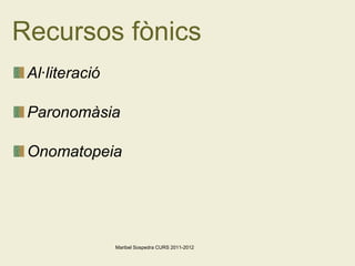 Paronomàsia Proximitat deparaules que sonen de la mateixa forma (homòfones) o semblant, bé perquè són de la mateixa família lèxica, bé perquè només es diferencien en un fonema. He fet senyor del seny a mon voler. Ausiàs March Maribel Sospedra CURS 2011-2012