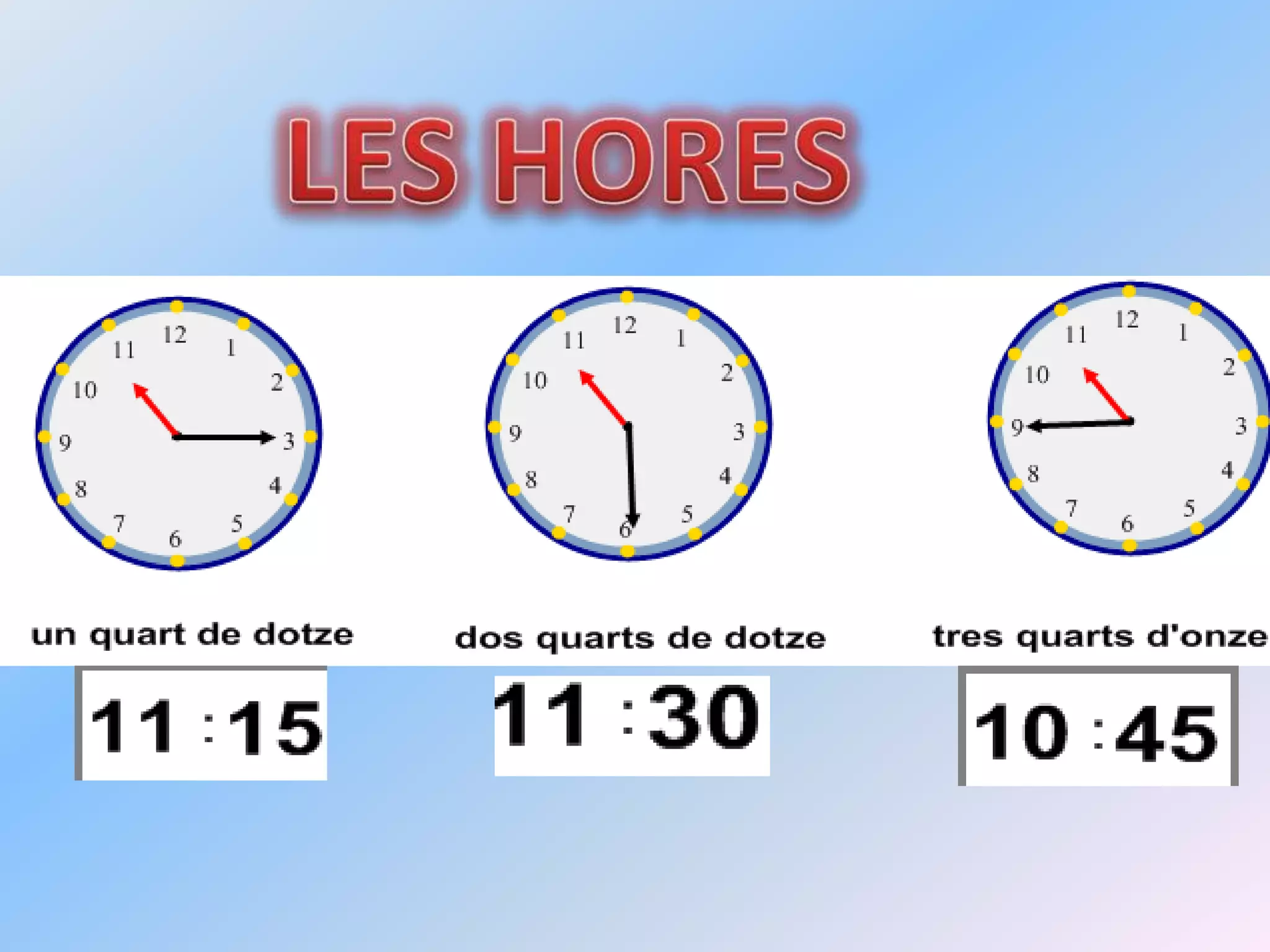 Dibuixa les busquesDosquarts de quatre.Tres quarts d’onzeUn quart de cinc.Un quart i cinc de tres.Dos quarts de set.Les vuit en punt.