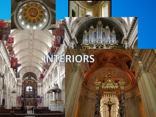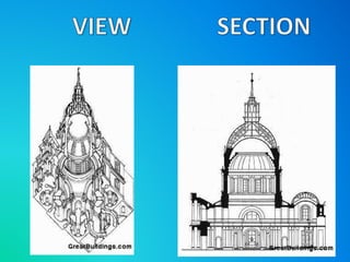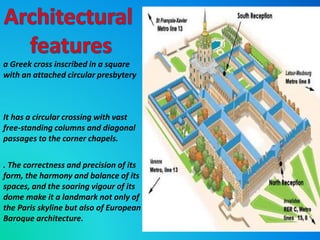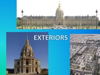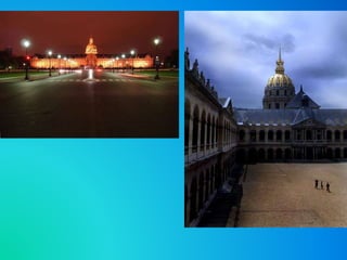 Les Invalides in Paris was originally designed as a hospital for disabled veterans and completed in 1677. It was later expanded with the addition of the Dome des Invalides, a gold-domed building designed by J.H. Mansart in 1680 now used as a burial site for French war heroes. The complex consists of museums and monuments related to French military history and is notable for housing Napoleon's tomb.