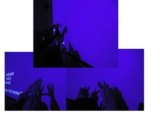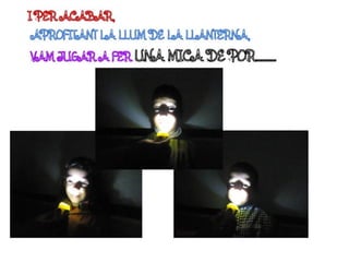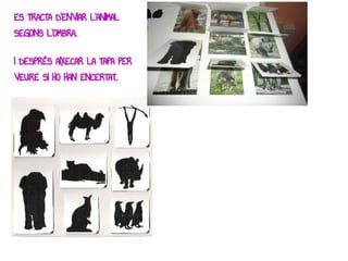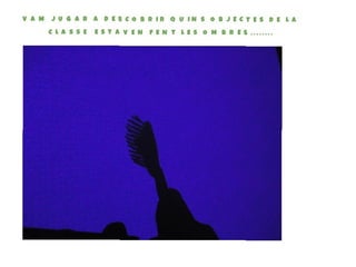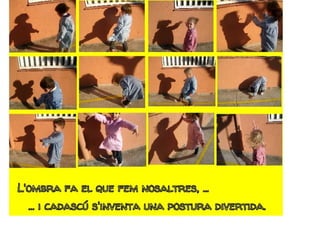 The document describes an activity with children where they explored shadows and light. They discovered that shadows are the same color regardless of the original color. They found that their shadows move as they move in relation to the light source. They determined that the sun is what creates the shadows outside by seeing that their shadows changed sides as they moved.