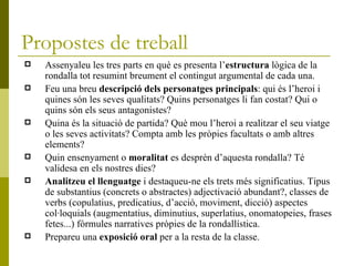 Propostes de treballAssenyaleu les tres parts en què es presenta l’ estructura lògica de la rondalla tot resumint breument el contingut argumental de cada una. Feu una breu descripció dels personatges principals : qui és l’heroi i quines són les seves qualitats? Quins personatges li fan costat? Qui o quins són els seus antagonistes? Quina és la situació de partida? Què mou l’heroi a realitzar el seu viatge o les seves activitats? Compta amb les pròpies facultats o amb altres elements? Quin ensenyament o moralitat es desprèn d’aquesta rondalla? Té validesa en els nostres dies? Analitzeu el llenguatge i destaqueu-ne els trets més significatius. Tipus de substantius (concrets o abstractes) adjectivació abundant?, classes de verbs (copulatius, predicatius, d’acció, moviment, dicció) aspectes col·loquials (augmentatius, diminutius, superlatius, onomatopeies, frases fetes...) fórmules narratives pròpies de la rondallística. Prepareu una exposició oral per a la resta de la classe.