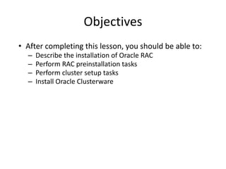 This document provides an overview of installing Oracle Clusterware and Oracle RAC. It describes preinstallation tasks like checking hardware and software requirements, creating users and groups, and configuring the cluster. It then outlines the two-phase installation process which first installs Oracle Clusterware, including configuring the OCR, voting disk and private interconnect. It then discusses installing the Oracle database software and additional post-installation verification steps.