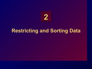 This document discusses how to limit and sort data retrieved from a database table using SQL queries. It covers using the WHERE clause to restrict rows by conditions, comparison operators like = and BETWEEN, logical operators like AND and OR, and the ORDER BY clause to sort rows in ascending or descending order based on one or more columns. Examples are provided for each technique.