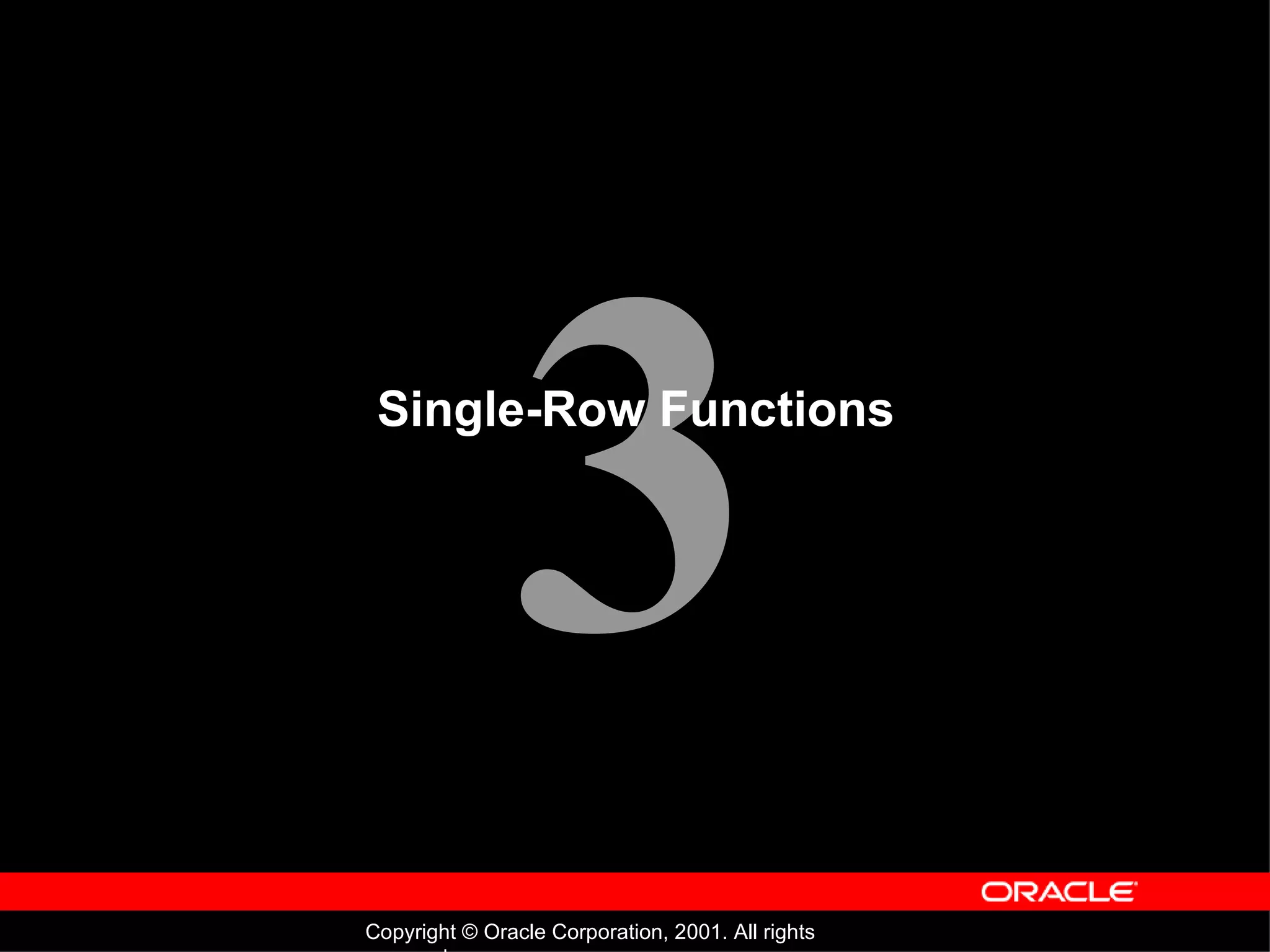 This document provides an overview of single-row functions in SQL. It describes various types of functions including character, number, date, conversion and general functions. It provides examples of how to use these functions in SELECT statements to manipulate and return data from individual rows. Key functions discussed include TO_CHAR, TO_NUMBER, TO_DATE, NVL, CASE, and DECODE. The document aims to describe how to use SQL functions to modify individual data items and output for groups of rows.