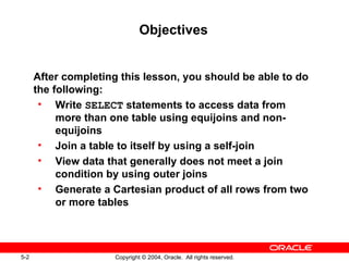 This document discusses different types of joins in SQL for combining data from multiple tables, including equijoins, non-equijoins, outer joins, self-joins, natural joins, and cross joins. It provides examples of SQL statements using various join types and explains how to qualify column names, use table aliases, apply conditions to joins, and avoid Cartesian products. The goal is for readers to learn how to write SELECT statements to retrieve and display data involving two or more tables.