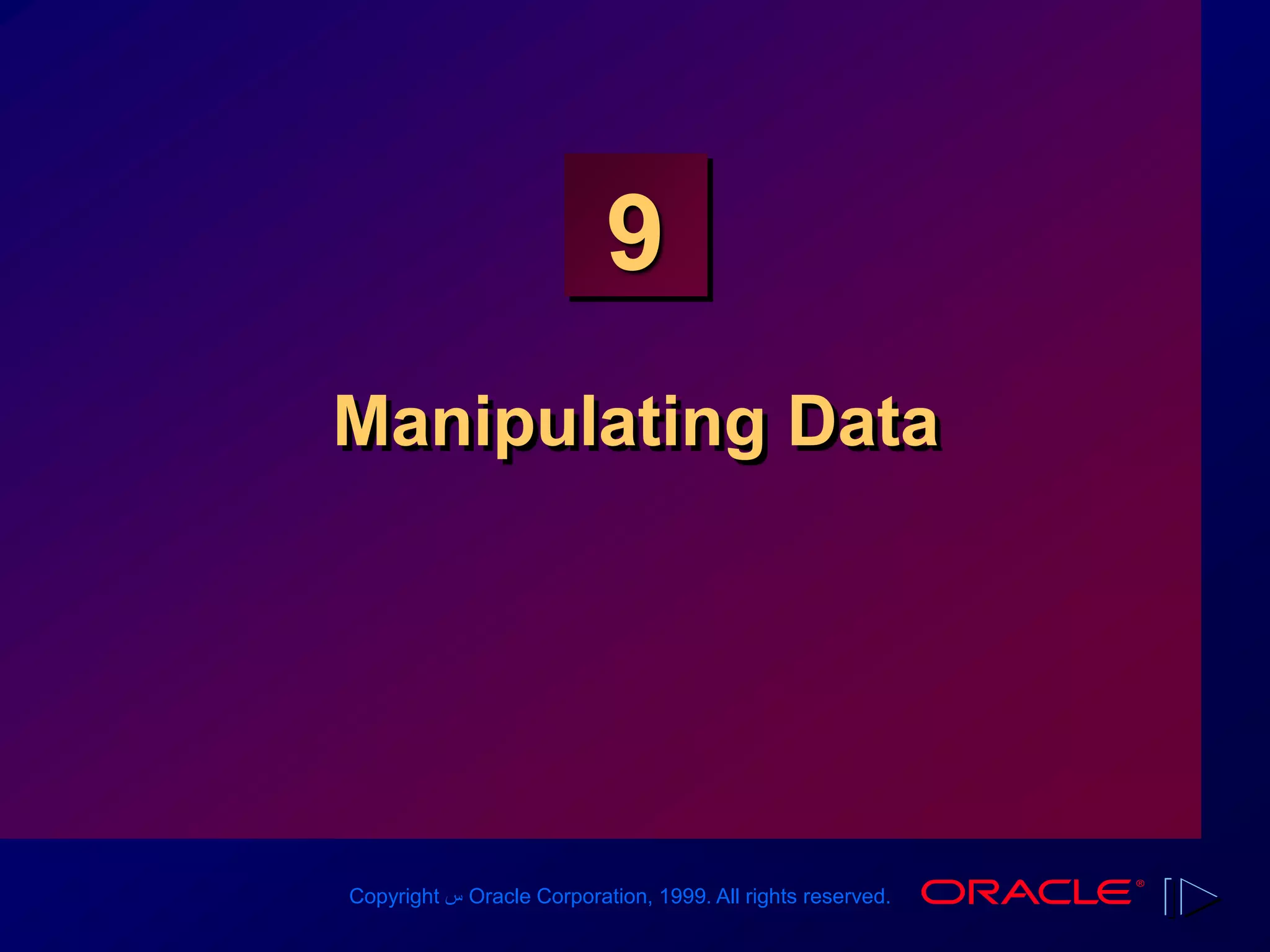 The document provides an overview of Data Manipulation Language (DML) statements, explaining how to insert, update, and delete rows in a database table. It covers transaction control, including commit and rollback processes, as well as error handling and maintaining data consistency. Additionally, it addresses the use of subqueries and savepoints for managing changes within transactions.