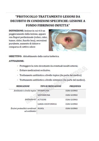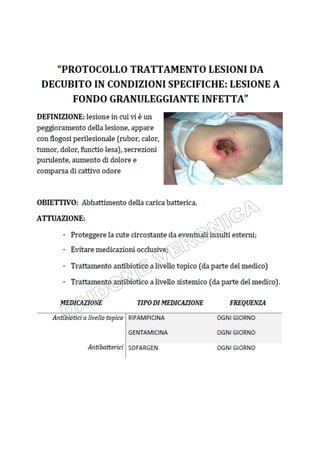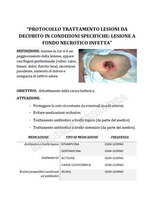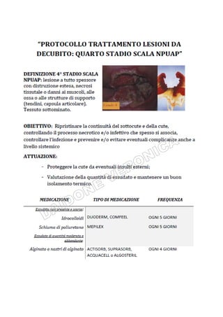 Il documento tratta la valutazione e gestione delle lesioni da decubito, evidenziando l'importanza della prevenzione attraverso la valutazione del rischio, l'implementazione di misure preventive e il monitoraggio continuo. Si utilizza la scala Braden per identificare i pazienti a rischio e si delineano strategie specifiche per il trattamento e l'educazione sanitaria. Uno degli obiettivi principali è garantire l'integrità cutanea e migliorare la qualità dell'assistenza ai pazienti vulnerabili.