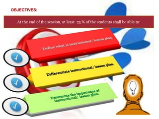 This document contains a series of lesson plans for instructional modules on management of instruction at Mindanao State University College of Education. The lessons cover topics such as the definition and importance of instructional/lesson planning, criteria for effective instructional objectives using the SMART framework, and the difference between goals and learning objectives. The lessons provide objectives, content outlines, and sources for each topic. They are intended to help at least 75% of students understand concepts related to effective lesson planning and goal/objective setting.