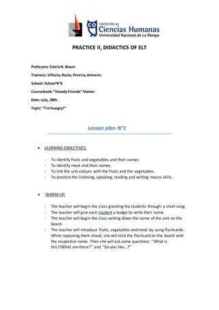 The lesson plan aims to teach students about fruits, vegetables, and meats through various activities. The warm-up introduces fruits and vegetables using flashcards to practice listening and speaking. Students then match drawings to words, cut and glue pictures into categories, and fill in missing vowels and blanks to reinforce vocabulary. The activities target identifying names, linking colors, and practicing listening, speaking, reading, and writing skills.