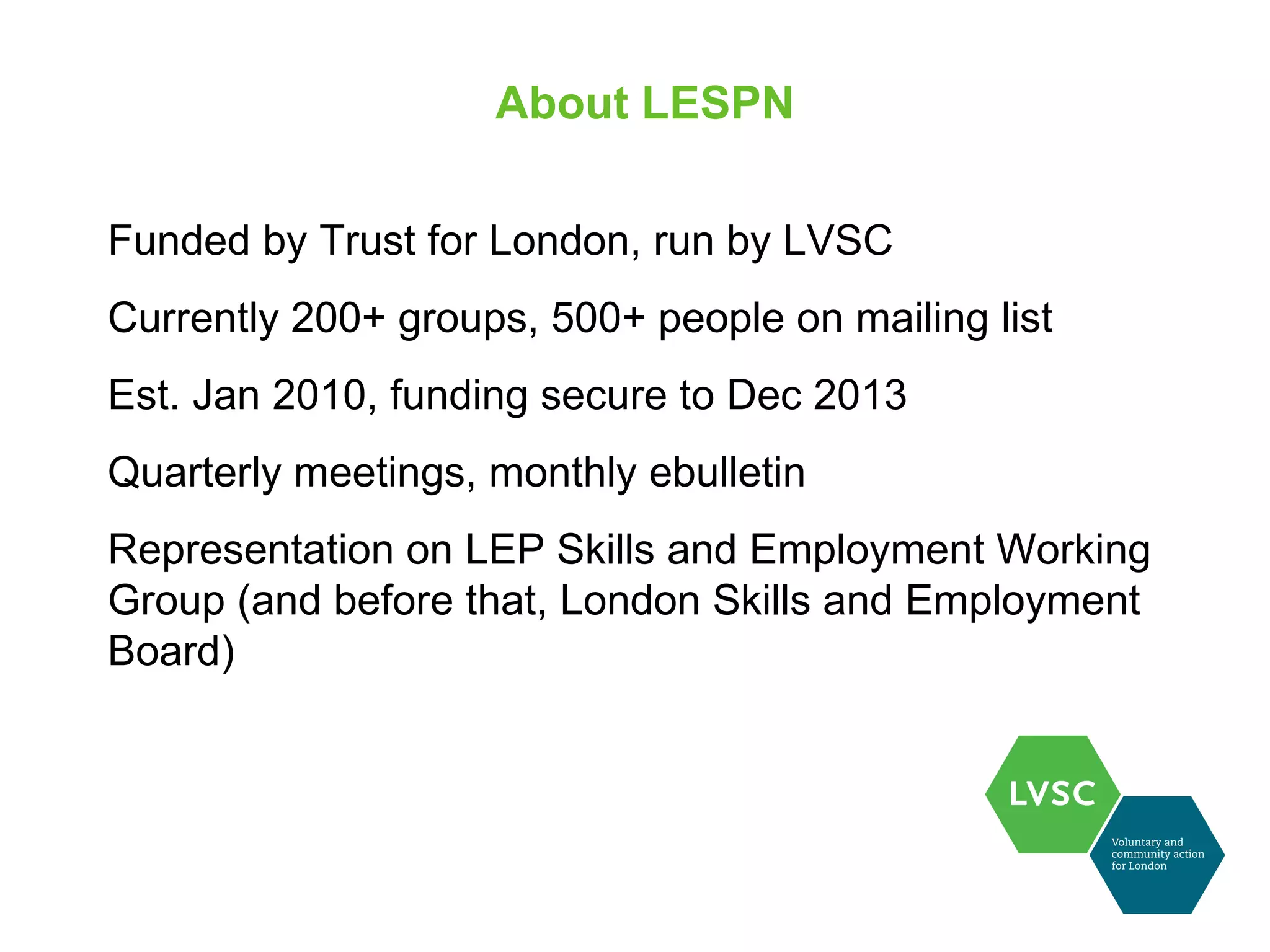 The London Employment and Skills Policy Network (LESPN) is funded by Trust for London and run by London Voluntary Service Council (LVSC) to influence employment and skills policy and provision serving disadvantaged communities in London. LESPN objectives are to provide a forum for the voluntary and community sector to share information and good practice, and raise the profile of their work. Key areas of work include influencing employment and skills provision through gathering evidence on major programs, surveying providers, and evidencing the impact and value of voluntary sector delivery. LESPN also aims to support frontline voluntary organizations and their representative on the London Enterprise Panel.