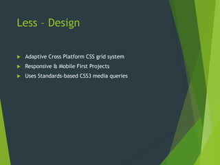 The document describes a CSS grid system called 'less' that is adaptive and works across various platforms, offering responsive layouts for different devices. It supports multiple browser and device compatibility, featuring four layouts with several typography presets suitable for desktops, tablets, and mobile devices. Additionally, it employs media queries to adjust layouts based on device sizes, ensuring accessibility for users with older browsers.