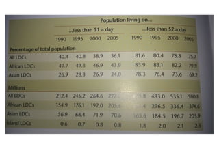 The document discusses the Least Developed Countries (LDCs) and challenges they face. It defines LDCs as the poorest countries based on low income, human development weaknesses, and economic vulnerability. LDCs struggle with widespread poverty, lack of political stability, high debt levels, and dependence on foreign aid. The document also summarizes Rostow's model of economic growth stages and its criticism, which suggests countries need capital to develop but aid has not pushed all countries past traditional stages.
