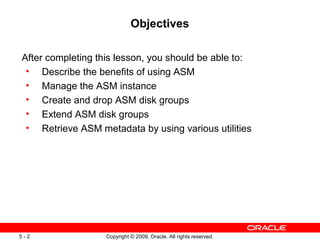 The document describes managing the Oracle Automatic Storage Management (ASM) instance. It discusses initializing and starting the ASM instance, creating and dropping ASM disk groups, adding and removing disks from disk groups, and retrieving ASM metadata. The key benefits of ASM include eliminating tasks such as file system management and performance tuning of storage.