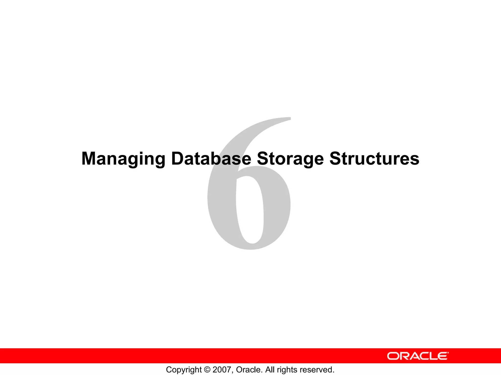 This document discusses managing database storage structures in Oracle. It describes how table data is stored in blocks and segments across tablespaces and data files. It covers locally managed and dictionary-managed tablespaces, and how to create, alter, and drop tablespaces. It also provides an overview of Automatic Storage Management (ASM) which manages Oracle database files.