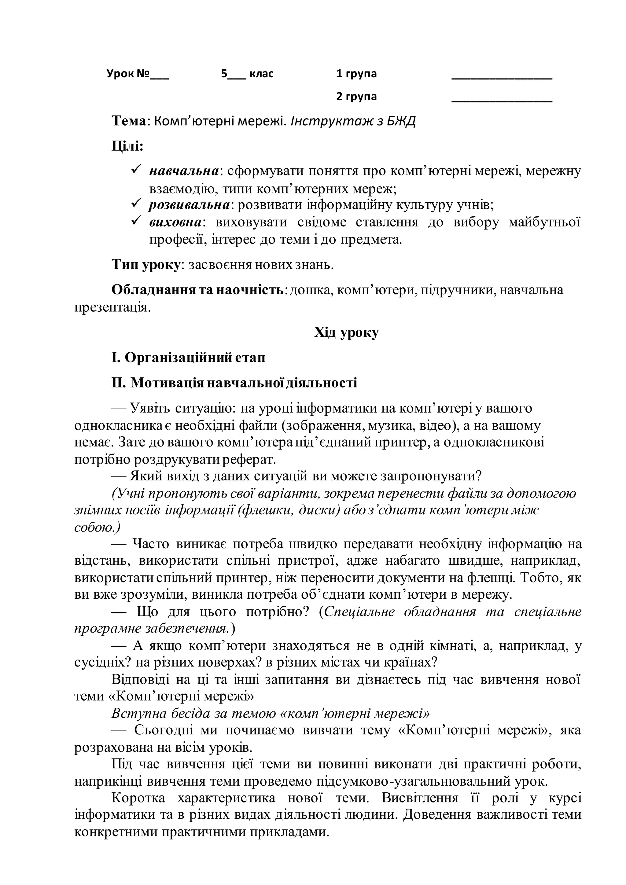 Тема: Комп’ютерні мережі. Інструктаж з БЖД