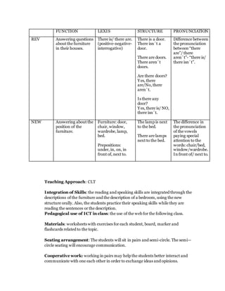 - Activities included identifying furniture in flashcard images, asking and answering questions about furniture in homes using the target structures, and a reading activity identifying furniture positions in a bedroom description using prepositions of place.