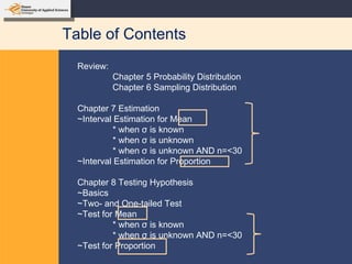 This document provides an outline and overview of topics covered in a course on inductive statistics, including probability distributions, sampling distributions, estimation, and hypothesis testing. Key topics discussed include interval estimation for means and proportions, using t-distributions when sample sizes are small and variances are unknown, and the basics of hypothesis testing such as null and alternative hypotheses. Examples are provided to illustrate concepts like confidence intervals for means, proportions, and hypothesis testing.