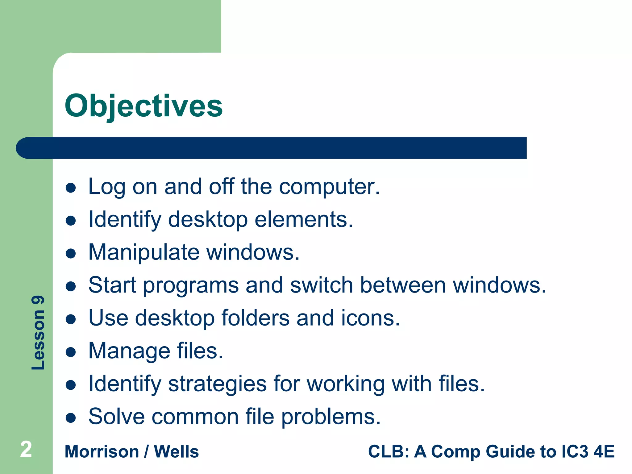 This lesson covers basic Windows management. It discusses how to log on and off, identify desktop elements like the taskbar and icons, and manipulate windows. It explains how to start programs, switch between windows, and use desktop folders. The lesson also covers managing files with the Computer window, including sorting, moving, copying and deleting files. It provides strategies for working with files like naming, organizing, backing up and deleting files, as well as solutions for common file problems.