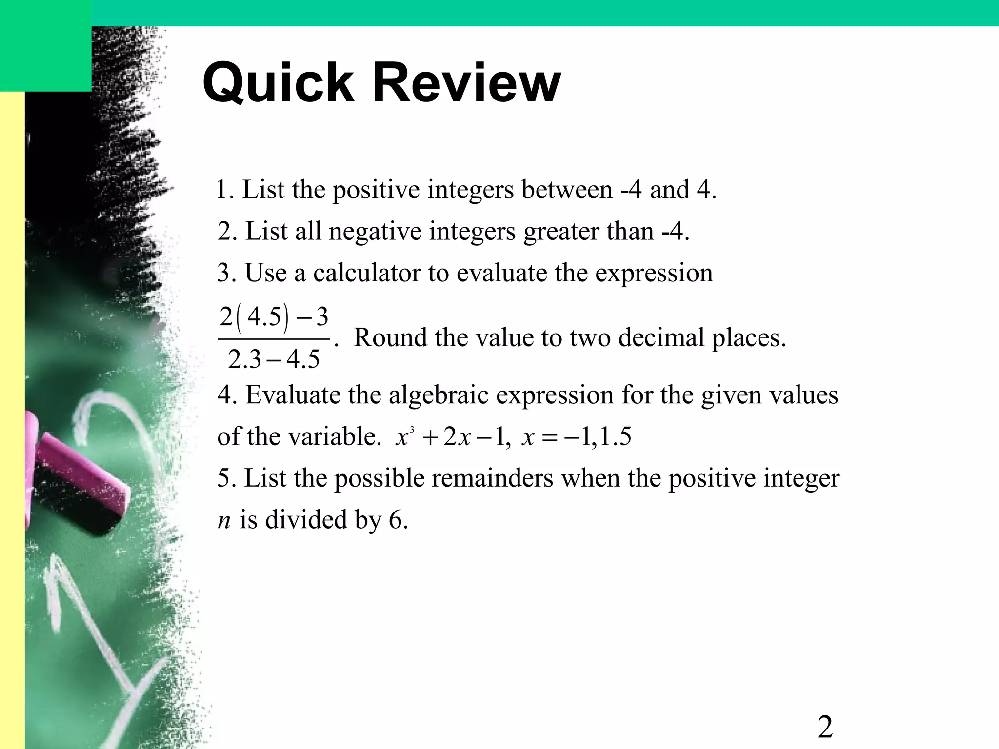 2) It discusses ordering real numbers and using symbols like <, >, ≤, ≥ to compare them. Properties of addition, multiplication and other operations are also covered.