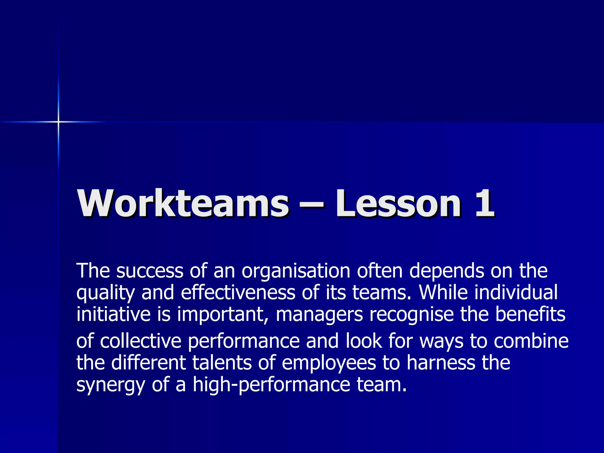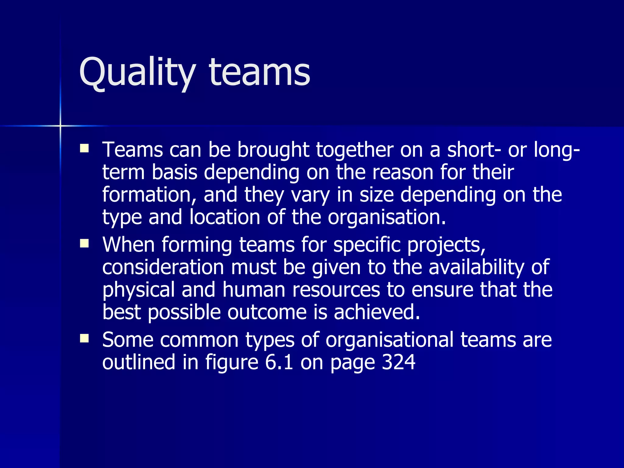The document discusses how organizations form teams to harness employee talents and achieve synergy. It explains that teams vary in size and composition depending on their purpose and organization. When forming teams for projects, consideration must be given to available resources to ensure the best outcome. Key characteristics of successful teams include an appreciation of diverse talents, commitment to a shared purpose, and the ability to self-evaluate performance.