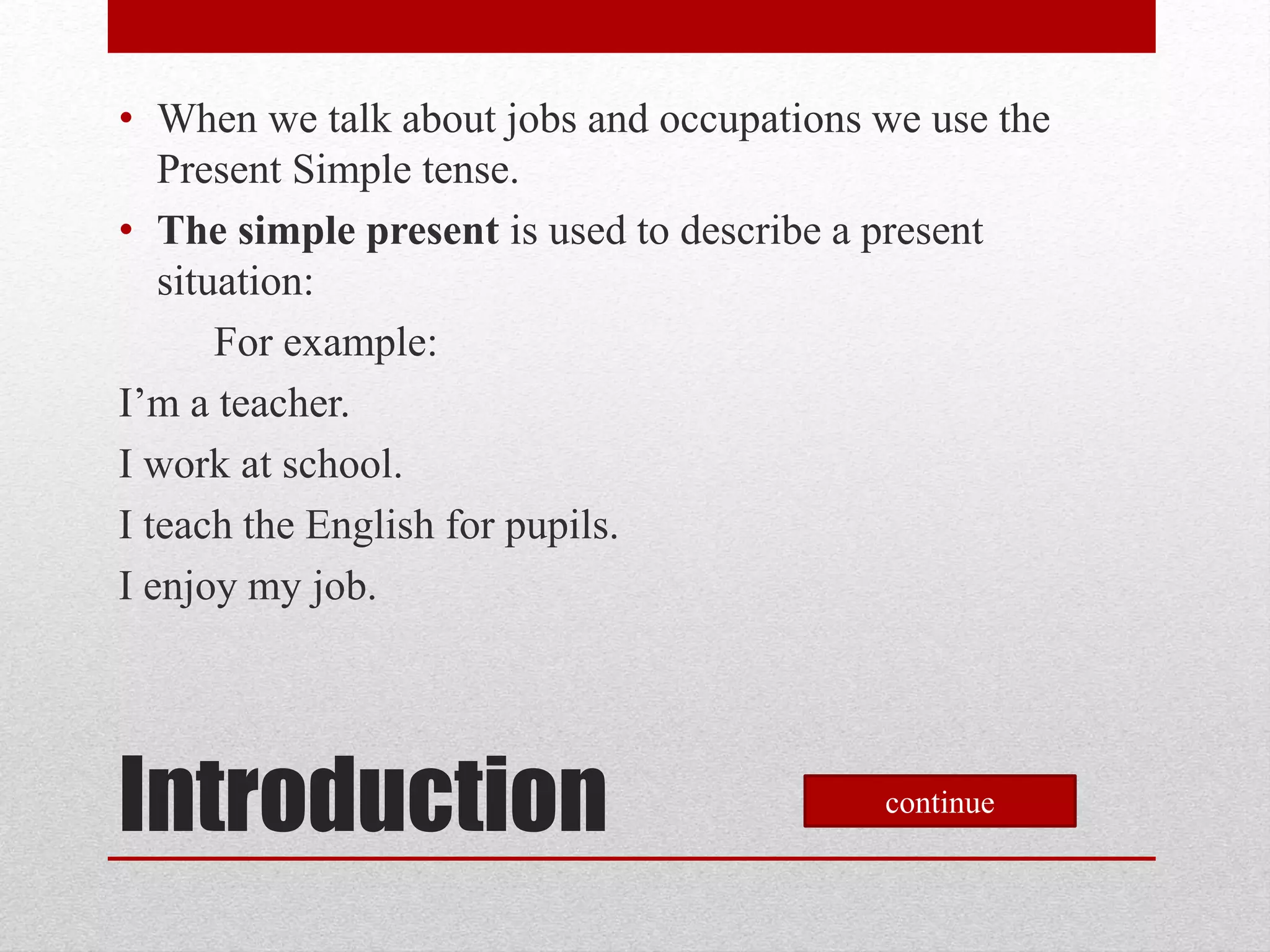 The document provides information about various jobs and occupations. It discusses jobs in terms of using the present simple tense to describe what a person "is" and "does" in their occupation. Examples are given of describing common jobs in the third person such as "a doctor cures patients" or "a flight attendant looks after passengers". A crossword puzzle then reviews some common occupations like pilot, chef, doctor, and firefighter.