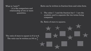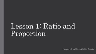 Lesson 1 introduces ratios and proportions. A ratio compares two or more quantities and can be written in fraction or colon form. Ratios can be simplified by dividing both quantities by their greatest common factor. Two ratios are equivalent if they can be expressed as the same simple ratio. A proportion is a statement of equality between two ratios. It involves setting the product of the means equal to the product of the extremes, where the extremes are the first and last terms and the means are the second and third terms. To solve a proportion, the ratios are set up as fractions, cross-multiplied, and then solved.