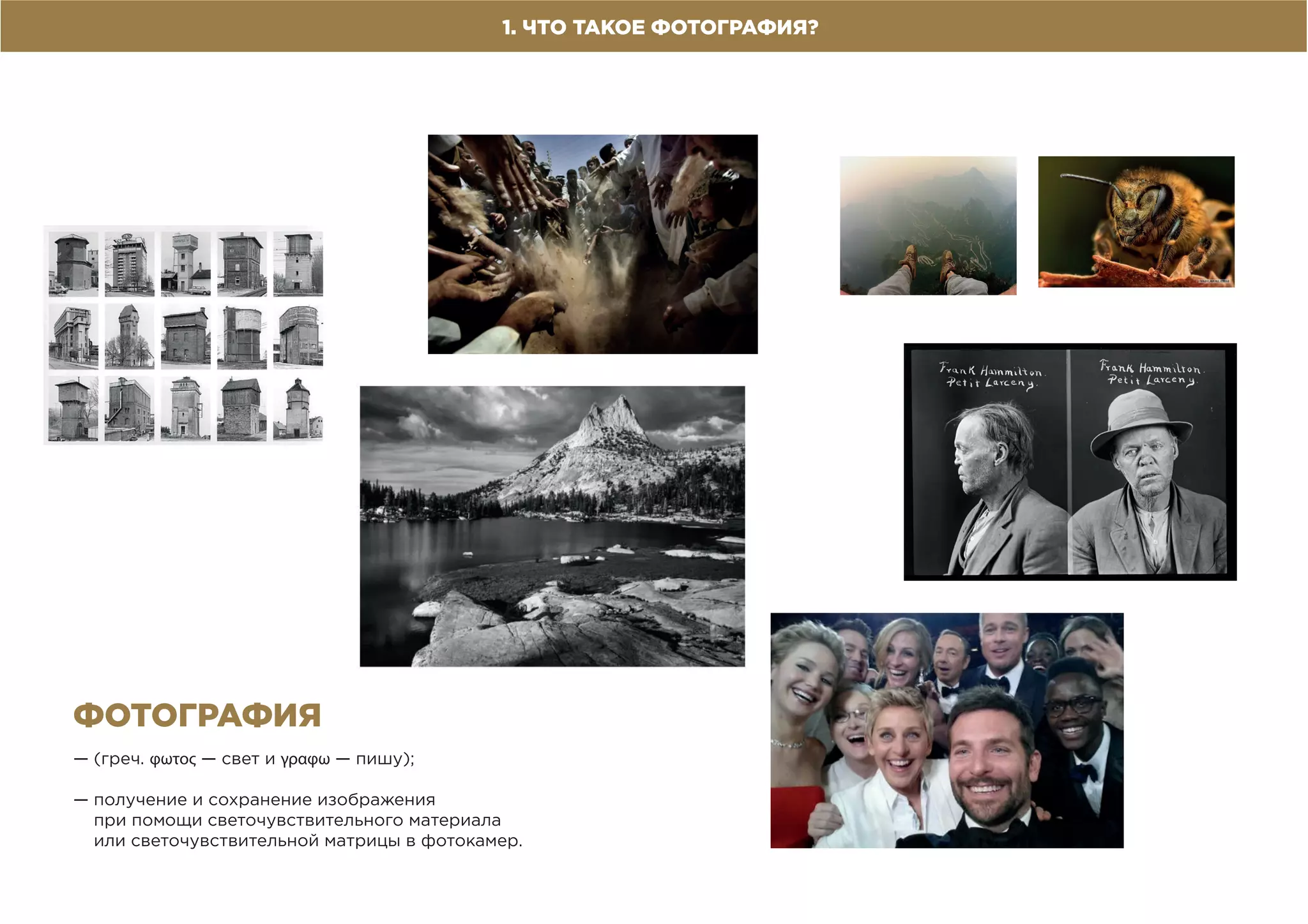 Документ описывает основы фотографии, начиная с её определения и истории, включая изобретение первого фотоаппарата в 1826 году. Рассматриваются ключевые элементы, такие как камера обскура, выдержка, диафрагма и светочувствительность. Также упоминается развитие цифровых технологий, включая появление первой цифровой камеры в 2006 году.