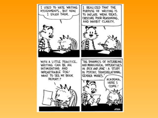 This document discusses the differences between informal, semi-formal, and formal levels of language and their appropriate uses. It notes that while personal experiences and opinions are valid in academic writing, they must be placed in a wider context and analyzed objectively rather than emotionally. The document provides guidance on when it may or may not be appropriate to use first-person pronouns in academic writing based on the assignment and professor's preferences. It also reviews key aspects of writing good topic sentences for paragraphs such as introducing the topic, making a point, and having an appropriate scope.