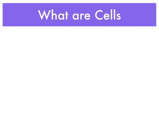 Cells are the smallest unit of life that carry out basic life processes. Cells come from other cells through cell division and splitting into two. Organisms can be unicellular, with one cell, or multicellular, with many cells. Animal cells contain organelles like the cell membrane, nucleus, mitochondria and vacuoles that perform life functions. Plant cells have a cell wall and chloroplasts in addition to these organelles. Cells organize into tissues, tissues into organs, and organs into organ systems to form complex living organisms.