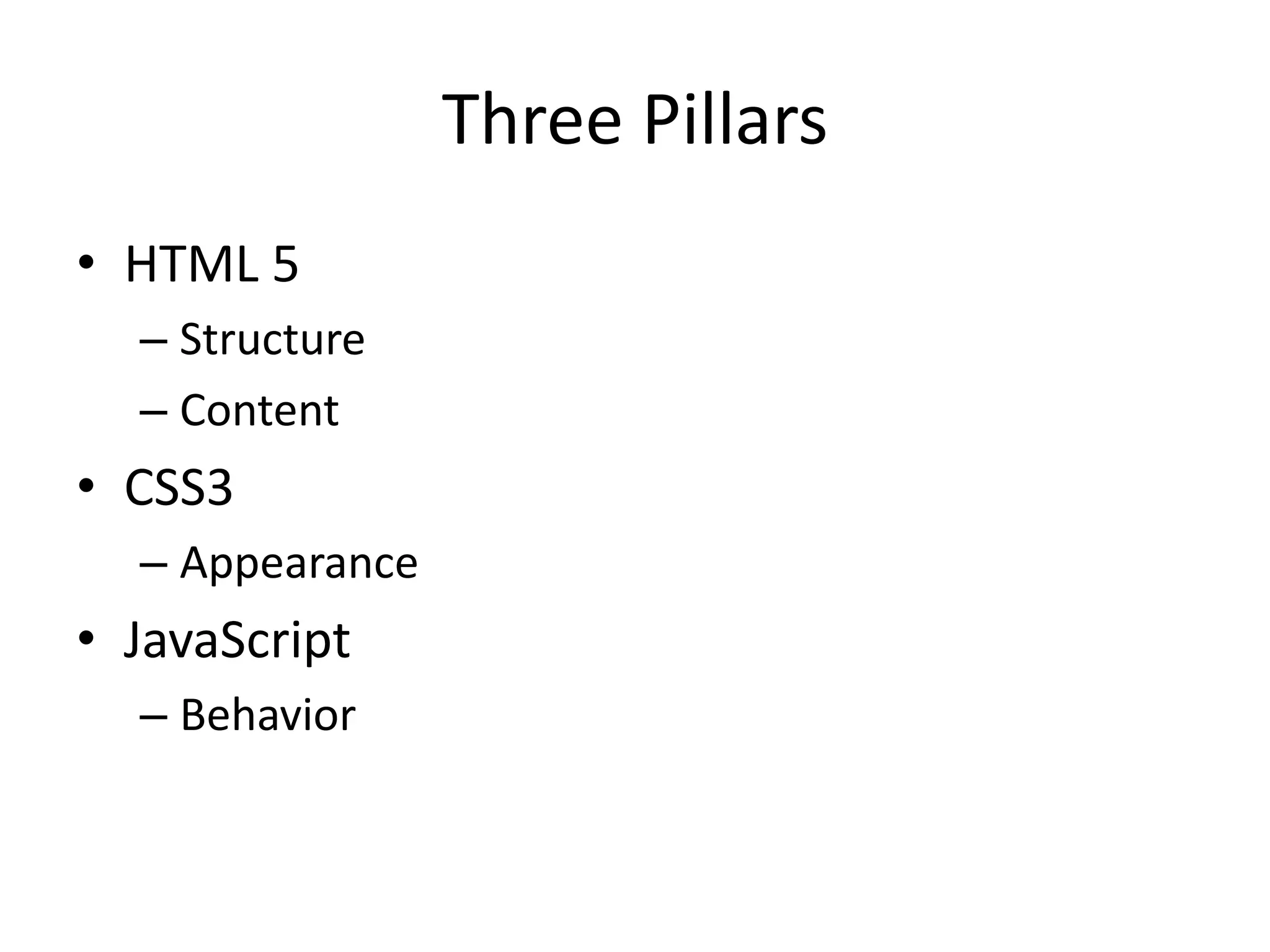 HTML provides the structure and content of web pages through elements like paragraphs, headings, lists, and images. CSS controls the appearance through properties that define colors, fonts, and layout. JavaScript adds interactive behaviors. The document recommends building web pages with progressive enhancement - starting with basic HTML content and layering on CSS and JavaScript. It also covers the key parts of an HTML page like the head, body, and common tags used to provide structure and semantics.