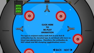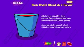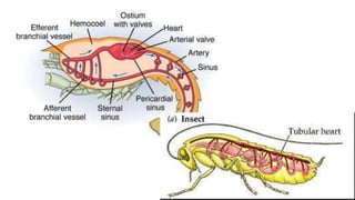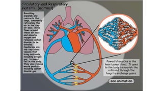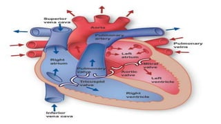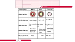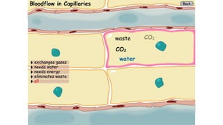 The circulatory system transports blood throughout the body to deliver oxygen and nutrients to cells and remove waste. It includes the heart, which pumps blood through vessels. There are three main types of blood vessels - arteries, which carry blood away from the heart; veins, which carry blood back to the heart; and capillaries, which connect arteries and veins and allow exchange of materials with body cells. The circulatory system moves blood in a double circulation from the heart to the lungs and back, and from the heart to all body tissues before returning to the heart.