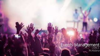 The document discusses events management and the events industry. It defines what an event is, provides the history and evolution of events, and describes the characteristics of events. It then discusses events management as the application of project management principles to plan, create, and develop various types of events. The document also outlines the key roles in an event team and provides an overview of the events industry in the Philippines, including the growth of the MICE (Meetings, Incentives, Conventions and Exhibitions) sector.