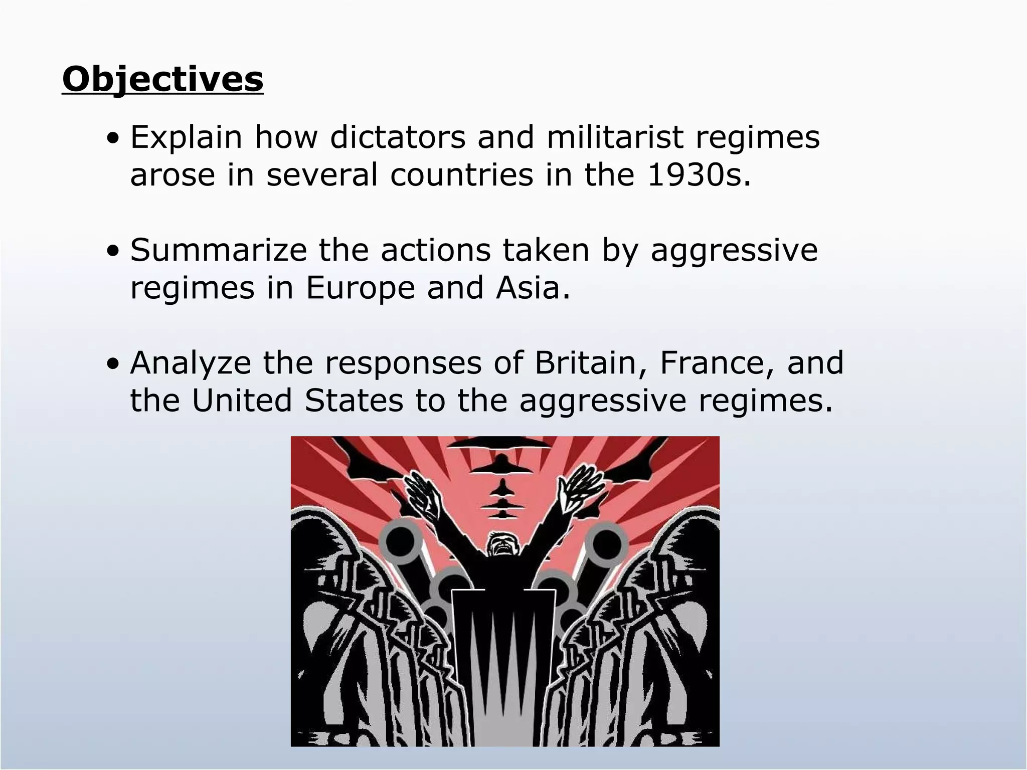 Totalitarian states arose in several European and Asian countries in the 1930s in response to economic hardship and nationalist sentiment following World War I. These regimes, led by figures like Stalin, Mussolini, and Hitler, promised to restore prosperity but ruled through oppression and violence. They pursued aggressive expansionist policies, with Germany rearming and invading neighboring lands while Japan invaded Manchuria and parts of China. Britain and France responded weakly, pursuing appeasement rather than standing up to the growing threats to peace.