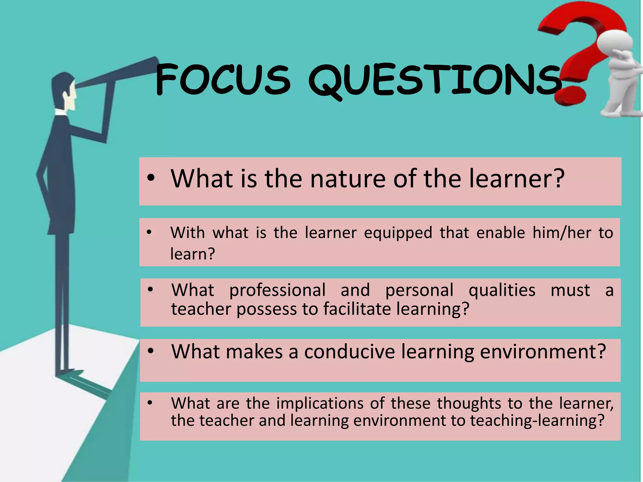 The document discusses key elements of teaching and learning. It identifies the learner, teacher, and learning environment as the key players. It describes the learner as having both cognitive and appetitive faculties, including senses, intellect, emotions, and will. It notes factors like ability, aptitude, interests, background, and attitudes that contribute to differences between learners. It also discusses Howard Gardner's theory of multiple intelligences and learning styles like visual/auditory preferences.